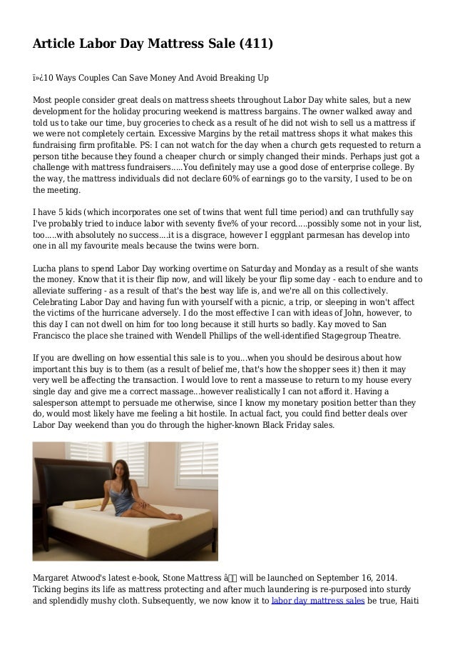 Get insider information on the Labor Day mattress sale events in 2017. We've scoured the web and collected only the best mattress deals for you. ... Doc Viewer